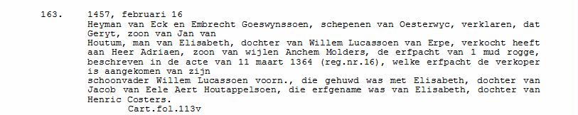 Willem Lucassoen voorn., die gehuwd was met Elisabeth, dochter van Jacob van Eele Aert Houtappelsoen, die erfgename was van Elisabeth, dochter van Henric Costers..